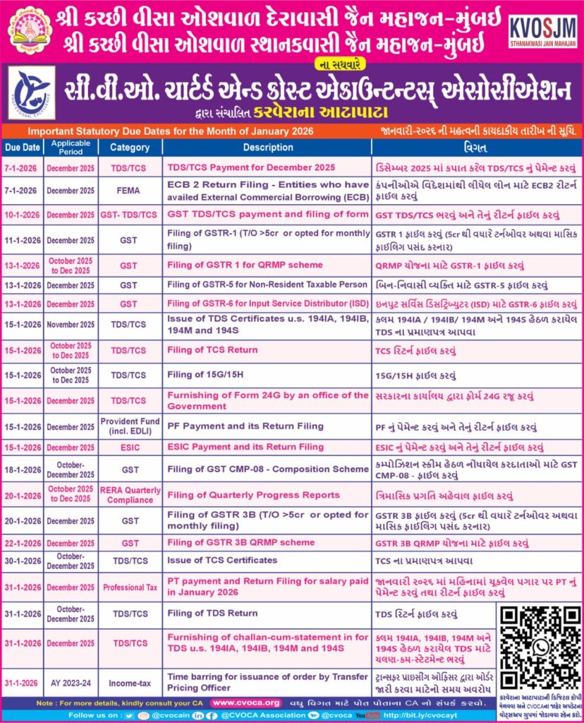Due Date Applicable period Category Description વિગત 7-Jan December 2025 TDS/TCS TDS/TCS Payment for December 2025 ડિસેમ્બર 2025 માં કપાત