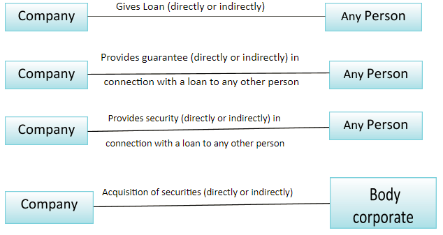 • No company shall, directly or indirectly, advance any loan, including any loan represented by a book debt to, or give any guarantee or provide any security in connection with any loan taken by, —