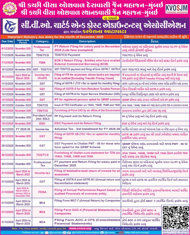 | 28-Feb | January 2026 | TDS/TCS | Furnishing of challan-cum-statement in for TDS u.s. 194IA, 194IB, 194M and 194S | કલમ 194IA, 194IB, 194M અને 194S હેઠળ કરાયેલ TDS માટે ચલણ-કમ-સ્ટેટમેન્ટ ભરવું |